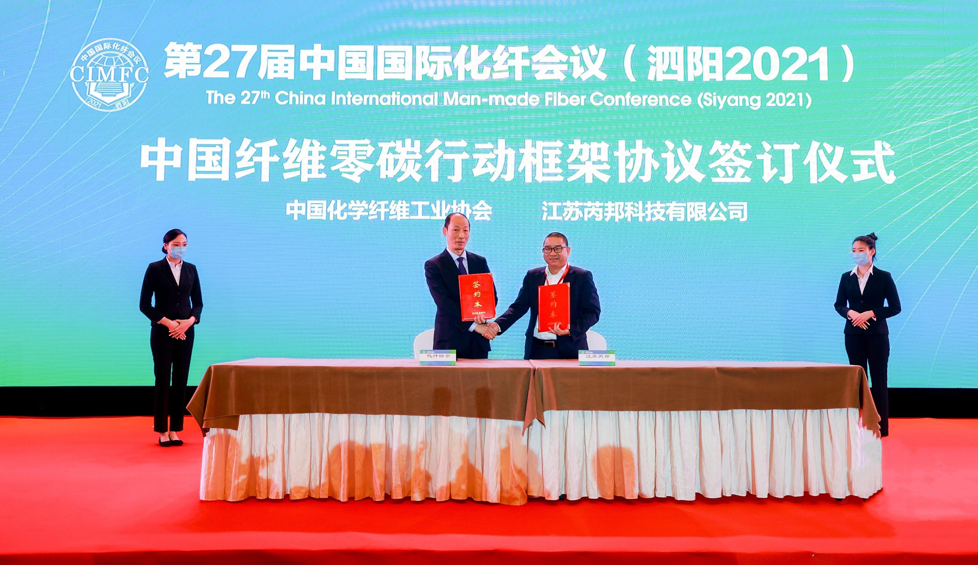 绿色是描绘行业发展成果的最美底色。在“双碳”战略下,作为推进碳达峰、碳中和的重要领域,中国纺织化纤行业一直走在世界的前列,行业企业在落实实现碳达峰、碳中和目标的进程中,承担着重要使命与责任。会议现。泄宋ひ敌嵬瞥隽较羁沙中贫“双碳”目标落实的新活动:一是中国化学纤维工业协会·江苏芮邦科技有限公司·中国纤维零碳行动(简称芮邦·中国纤维零碳行动)框架协议签约,二是绿色纤维制品可信平台发布会启动。